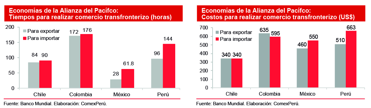 Al comparar los 4 indicadores que componen el pilar analizado entre el Perú y la data promedio de las economías de LAC, se puede observar que mientras nuestro país requiere de 96 horas y 144 horas para exportar e importar, respectivamente, LAC requiere de 115.8 horas y 144.3 horas. Asimismo, el Perú registra costos de US$ 510 y US$ 663 para exportar e importar, respectivamente, mientras que LAC registra US$ 637.1 y US$ 803.6. Así, si bien el Perú se encuentra sobre el promedio de LAC y sobre una de las economías pertenecientes a la Alianza del Pacífico, este es el caso de Colombia (125 a nivel mundial y 24 en LAC), cuando se hace la comparación con los otros dos socios el resultado difiere. Los indicadores de tiempos y costos en los procesos logísticos del comercio transfronterizo, como las posiciones dentro del ranking, son significativamente más favorables para México (63 a nivel mundial y 4 en LAC) y Chile (68 y 7, respectivamente).