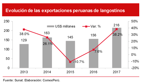 Al analizar la evolución de las exportaciones peruanas de langostinos, de acuerdo con cifras de la Sunat, estas alcanzaron un crecimiento promedio anual del 13.7% en el periodo 2013-2017, pese al resultado registrado en el periodo 2014-2015, cuando cayeron un 10.7%. Cabe resaltar que, en 2017, nuestras exportaciones de langostinos alcanzaron un récord histórico, al registrar un valor de US$ 216 millones, un 38.2% más que el monto exportado en 2016.