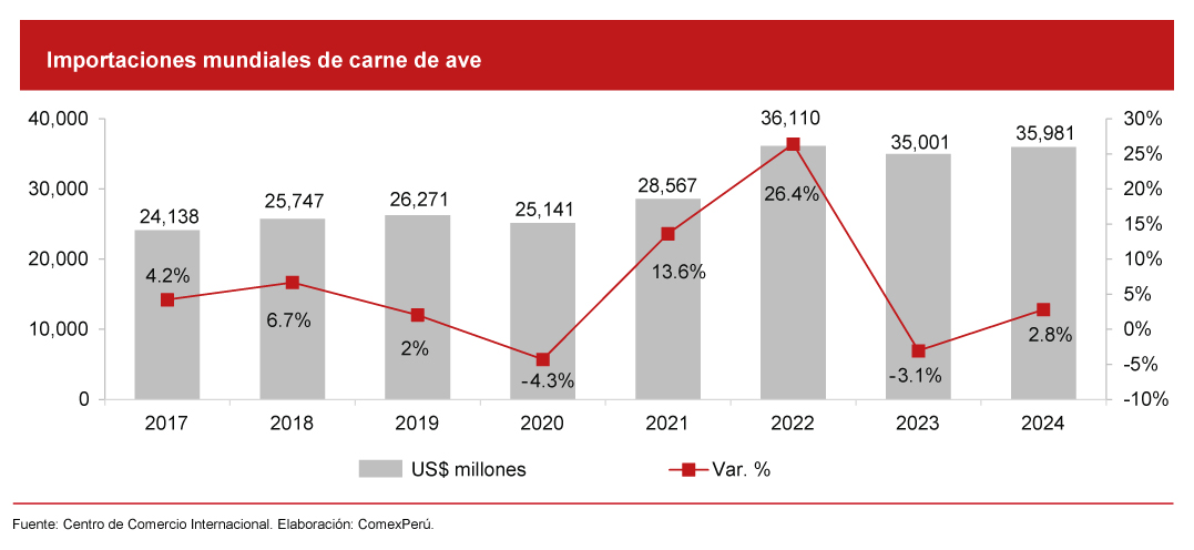 Aunque las cifras históricas de las exportaciones peruanas de carne de ave son menores, las compras mundiales continúan creciendo.