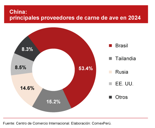 Por su parte, las importaciones chinas registraron un crecimiento promedio anual del 16.2% entre 2017 y 2024. Las compras del exterior alcanzaron los US$ 2,945 millones en el último año, lo que reflejó un descenso del 29.4% comparado con 2023. Esto se debió a las emergencias zoosanitarias que presentó su principal proveedor, Brasil, y generó una suspensión temporal. El país sudamericano representó el 53.4% de lo importado por China (US$ 1,572 millones). Le siguen en la lista de principales proveedores Tailandia, con US$ 449 millones, Rusia (US$ 430 millones) y EE. UU. (US$ 251 millones). Además, el 98% de lo importado fue carne de pollo en trozos congelada.