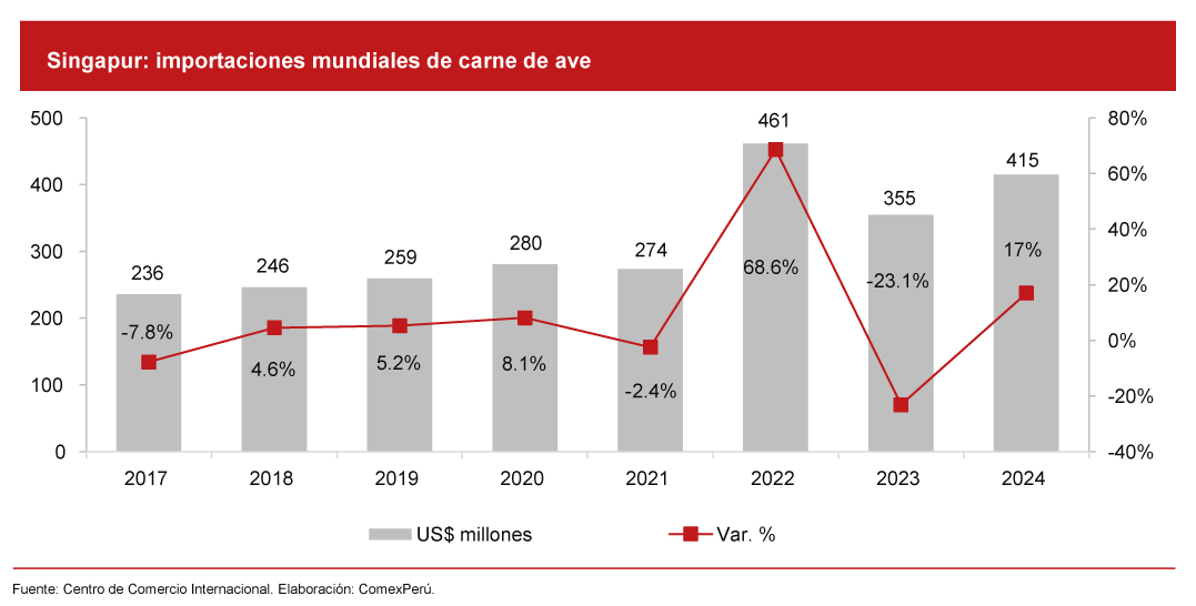 En cuanto a las compras internacionales de Singapur, este país importó carne de ave por un valor de US$ 415 millones durante 2024. Además, registró un crecimiento promedio anual del 8.4% entre 2017 y 2024. El pollo congelado fue el principal producto importado, bajo la presentación en trozos (US$ 315 millones) y entero (US$ 77.4 millones), además de compras de pato entero congelado (US$ 7.9 millones). Brasil se consolidó como el principal proveedor al representar el 70.4% del total importado (US$ 292 millones en 2024). Argentina, otro país sudamericano, forma parte de la lista, aunque con una participación menor: 1.9% y un valor de US$ 8.1 millones.