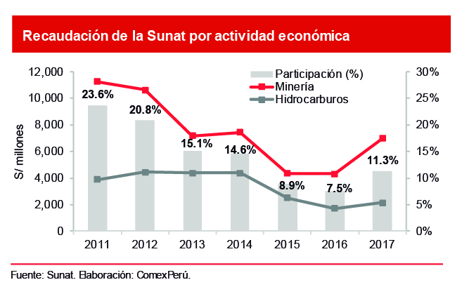 Un claro ejemplo de lo anterior es la tendencia decreciente que los recursos de la minería y del sector de hidrocarburos han presentado en los últimos años de la actual y la anterior gestión, aunque con un ligero repunte desde finales de 2017 debido al alza en los precios internacionales del crudo y de algunos metales. Según cifras del Instituto Nacional de Estadística e Informática (INEI), estos sectores representaron un 14% del PBI en 2017, por lo que las políticas para su desarrollo son de especial relevancia para la actividad económica del país. De acuerdo con cifras de la Sunat, los ingresos recaudados de estas actividades cayeron sostenidamente entre 2011 y 2017, al pasar de S/ 15,153 millones (23.6% del total recaudado) a S/ 9,138 millones (11.3% del total). No obstante, hacia abril de 2018, se recuperaron en un 70.4% más que lo recaudado en el mismo periodo de 2017.