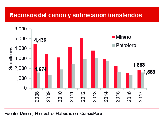 Así, los ingresos tributarios por concepto del impuesto a la renta (IR) de tercera categoría en estos dos sectores también se contrajeron un 68% en el periodo 2011-2017. Sin embargo, hacia abril último, debido en parte a la tendencia alcista en el precio de los commodities, el IR por minería e hidrocarburos repuntó un 87.3% con respecto al mismo periodo del año anterior. Otros indicadores son los ingresos por concepto de canon y regalías en estos sectores, que se vieron afectados en los últimos años. Por ejemplo, según información del Ministerio de Energía y Minas (Minem), las transferencias de recursos (canon, regalías, derechos de vigencia) generados por la minería para las regiones cayeron un 35.6% en el periodo analizado, mientras que, de acuerdo con información de Perupetro, las regalías por contratos de licencia y servicios en hidrocarburos cayeron un 58.5% en el mismo periodo.