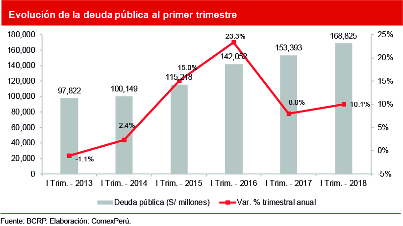 De acuerdo con cifras del BCRP, en el primer trimestre de 2018, el saldo de la deuda del sector público no financiero ascendió a S/ 168,825 millones (23.7% del PBI), un incremento del 10.1% con respecto al mismo periodo de 2017 (S/ 153,393 millones; 22.9% del PBI). De este total, S/ 61,298 millones (36%) correspondieron a deuda pública externa y S/ 107,527 millones (64%) a deuda pública interna.