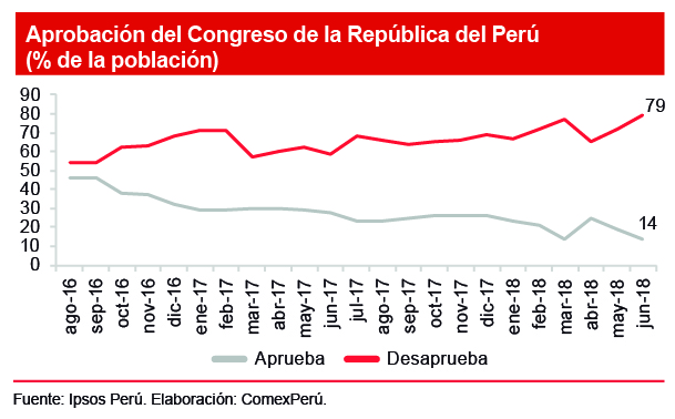 El 79% de peruanos desaprueba la gestión del Congreso de la República, de acuerdo con la última encuesta de Ipsos Perú. El peor nivel de aprobación y confianza desde el inicio de su gestión. Cabe destacar que este Poder Legislativo empezó sus actividades en agosto de 2016 con una aprobación de 46%, que fue disminuyendo progresivamente hasta cerrar ese año con un 32%. El 2017 no fue tampoco bueno para el Congreso. Tras los enfrentamientos políticos constantes con el Ejecutivo, la censura de varios ministros de Estado y el juego de poderes interno entre bancadas, el año finalizó para ellos con una aprobación de tan solo un 26%; porcentaje que luego siguió descendiendo tras el debacle político que culminó con la renuncia del presidente de la república en marzo de 2018. En dicho mes, la aprobación del Congreso tocó fondo y logro solo un 14%, cifra que se repitió este junio último, debido también a los escándalos de corrupción por compras sobrevaloradas.