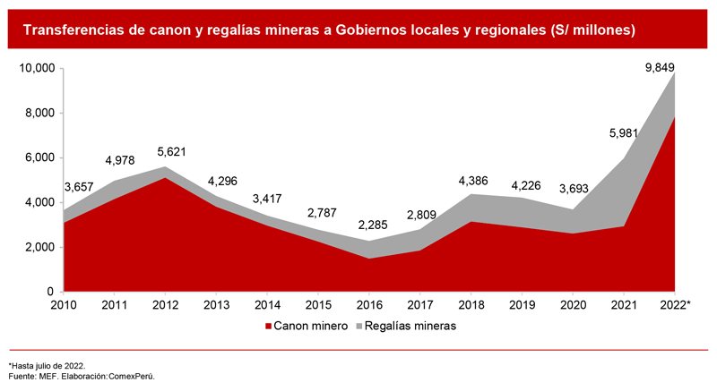 A nivel desagregado, solo las transferencias de canon minero en 2022 alcanzaron los S/ 7,844 millones, esto es, 2.7 veces más que lo transferido el año pasado. Cabe recordar que, de acuerdo con el actual calendario de trasferencias del canon, en enero se realiza un adelanto de este recurso y la segunda parte, en julio de cada año. Por su parte, las transferencias por concepto de regalías mineras hasta julio de 2022 ascendieron a S/ 2,005 millones. De igual manera, de acuerdo con el mecanismo que mantienen, las regalías se transfieren mensualmente a los departamentos.