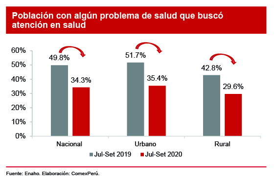 Para tener una idea, según cifras del INEI, entre julio y setiembre de 2020, solo el 34.3% de la población que reportó algún problema de salud buscó atención, lo cual significó una caída de 15.5 puntos porcentuales respecto del mismo periodo de 2019. No obstante, los lugares más recurridos fueron las farmacias o boticas (18.6%), seguidos por establecimientos del Minsa (6.5%) y particulares (5.5%). Ahora, si observamos el caso de la población con algún problema crónico, encontramos que solo 29 de cada 100 personas que reportaron sufrir enfermedades crónicas buscaron atención. Este escenario revela el gran déficit de atención en salud en el país, que se explicaría por el cierre temporal de establecimientos del primer nivel, así como por la congestión en el servicio enfocado en la atención de la COVID-19.