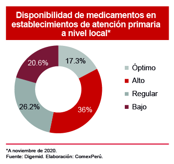 En esta línea, si enfocamos la mirada en la gestión de los medicamentos, encontramos que, al 30 de noviembre de 2020, un 20.6% de establecimientos del primer nivel de atención a nivel local se encontraban con una baja disponibilidad de medicamentos esenciales, un 26.2% con disponibilidad regular, un 36% con disponibilidad alta y solo un 17.3% con disponibilidad óptima, según información actualizada de la Dirección General de Medicamentos, Insumos y Drogas (Digemid). Por poner algunos ejemplos, las Direcciones Regionales de Salud de Madre de Dios, Loreto y Ucayali tienen más del 50% de sus establecimientos con baja de disponibilidad.