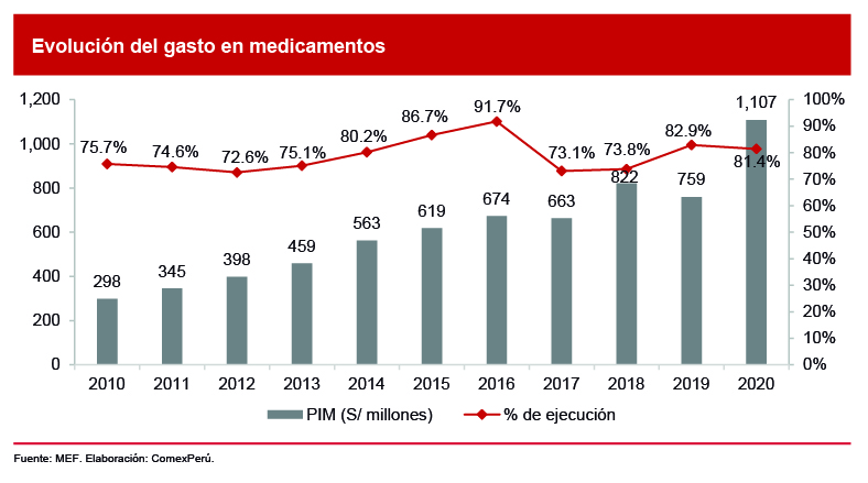Una aproximación a la eficiencia del proceso de gestión en medicamentos es la ejecución del presupuesto destinado al abastecimiento del sector. La ejecución promedio de esta partida en los últimos 10 años fue del 78.9%. Asimismo, llama la atención el sustancial incremento para medicamentos en 2020, con un total de S/ 1,107 millones y una variación del 45.8% respecto de 2019. Así pues, se observa un espacio de mejora en la gestión de compras de los medicamentos, el cual asegura su provisión a los pacientes de manera adecuada.