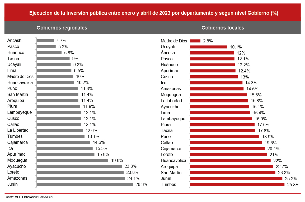 Como se sabe, 2023 es el primer año de gestión de las nuevas autoridades de los Gobiernos subnacionales, periodo en el que históricamente los niveles de ejecución presupuestal se mantienen bajos. De acuerdo con información del Ministerio de Economía y Finanzas (MEF), en 2023, las municipalidades tienen un presupuesto de S/ 20,991 millones para destinarlos a proyectos, mientras que el monto asignado a los Gobiernos regionales asciende a S/ 14,033 millones. Sin embargo, durante los cuatro primeros meses del año, estos ejecutaron S/ 3,400 millones y S/ 1,890 millones, lo que implica un avance de ejecución del 16.2% y el 13.5% en lo que va del año, respectivamente.