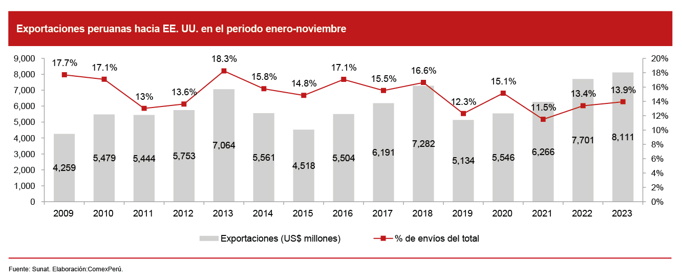 Según cifras de la Sunat, el valor de nuestras exportaciones a EE. UU., durante el período enero-noviembre de 2023, fue de US$ 8,111 millones, lo cual representó un 13.9% del total de nuestros envíos al mundo. Es el monto más elevado luego de 15 años desde la entrada en vigor de nuestro acuerdo comercial con el país norteamericano, periodo durante el cual ha representado, en promedio, un 15.1% de las exportaciones totales, con lo que se ha convertido en nuestro segundo destino más importante, luego de China. Este escenario subraya el continuo fortalecimiento de nuestras relaciones comerciales con el mercado estadounidense, lo que ha consolidado nuestra posición en un escenario internacional cada vez más competitivo.