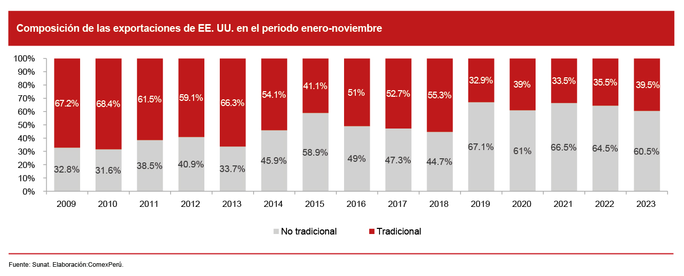 En cuanto al crecimiento interanual, entre los meses de enero y noviembre de 2009 y 2023, la tasa de crecimiento promedio anual de nuestras exportaciones a EE. UU. ha sido del 4.7%, con un aumento acumulado del 90.4%. Si bien se registró una caída en 2019 (-29.5%) y un leve crecimiento en 2020, debido a la pandemia (+8%), en los últimos años, el dinamismo ha sido positivo.