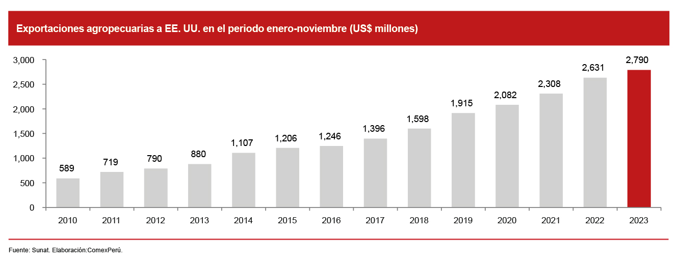 En el dinámico escenario de las exportaciones no tradicionales, el sector agropecuario ha desempeñado un papel crucial y representado una parte fundamental de nuestra contribución al comercio internacional. Durante el periodo enero-noviembre de 2023, las exportaciones agropecuarias de las exportaciones no tradicionales a EE. UU. sumaron US$ 2,790 millones, lo cual muestra un aumento del 6% respecto del mismo periodo de 2022. Así, se observa que las exportaciones agropecuarias del Perú hacia EE. UU. han emergido como un pilar fundamental en nuestra relación comercial bilateral.