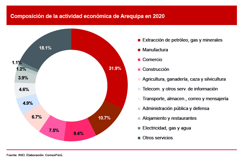 A lo largo de los años, los principales sectores que han movido la actividad económica del departamento de Arequipa han sido extracción de petróleo, gas y minerales; la manufactura y el comercio. Así, en 2020, dichos sectores, en conjunto, constituyeron el 52.1% de su VAB. Por el lado del sector extracción de petróleo, gas y minerales, este registró un PBI de S/ 8,456 millones en 2020, un 22.8% menor al de 2019. Dicho sector se vio principalmente afectado por las restricciones de movilidad, al igual que las demás actividades; no obstante, la situación se agravó por los conflictos sociales y la inestabilidad política en el último trimestre de 2020, según el boletín de producción nacional elaborado por el INEI. Aterrizando el análisis al contexto más reciente, de acuerdo con EY, la última medida impuesta por el Ejecutivo no implicaría grandes efectos en los niveles de extracción del departamento.