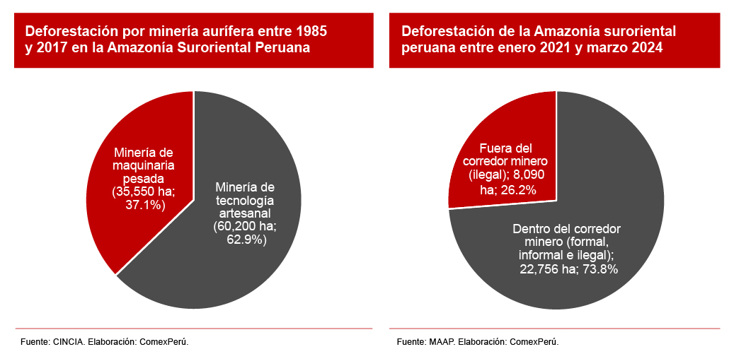 Según estimaciones más recientes del Proyecto de Monitoreo de la Amazonía Andina (MAAP), entre enero 2021 y marzo 2024 se perdieron en la misma zona 30,846 ha de bosque, de las cuales 8,090 ha (26.2%) se encuentran fuera del corredor minero, un área donde la minería artesanal y de pequeña escala es permitida (bajo cumplimiento de las regulaciones establecidas por ley). Es decir, esta última cifra es consecuencia de únicamente la actividad ilegal. El resto (22,756 ha; 73.8%) se encontraría dentro del corredor minero, siendo difícil el separar formales, informales e ilegales.