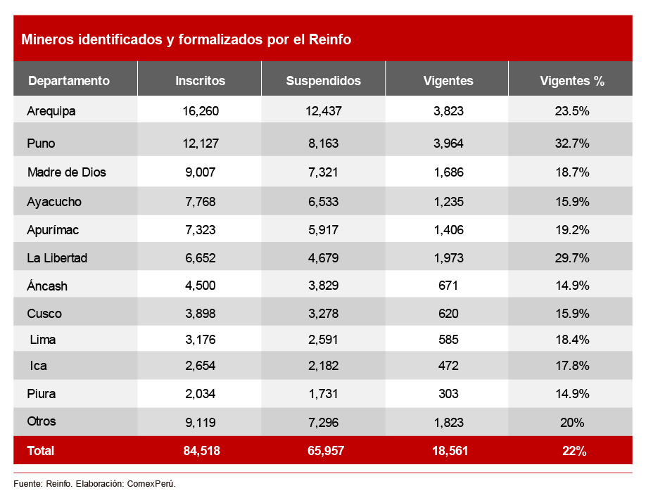 A nivel departamental, Arequipa posee el mayor número de mineros registrados con 16,260, de los cuales solo 3,823 (23.5%) se encuentran en estado vigente. A este le siguieron Puno (12,127 mineros registrados; 3,964 vigentes; 32.7% del total) y Madre de Dios (9,007; 1,686; 18.7%).