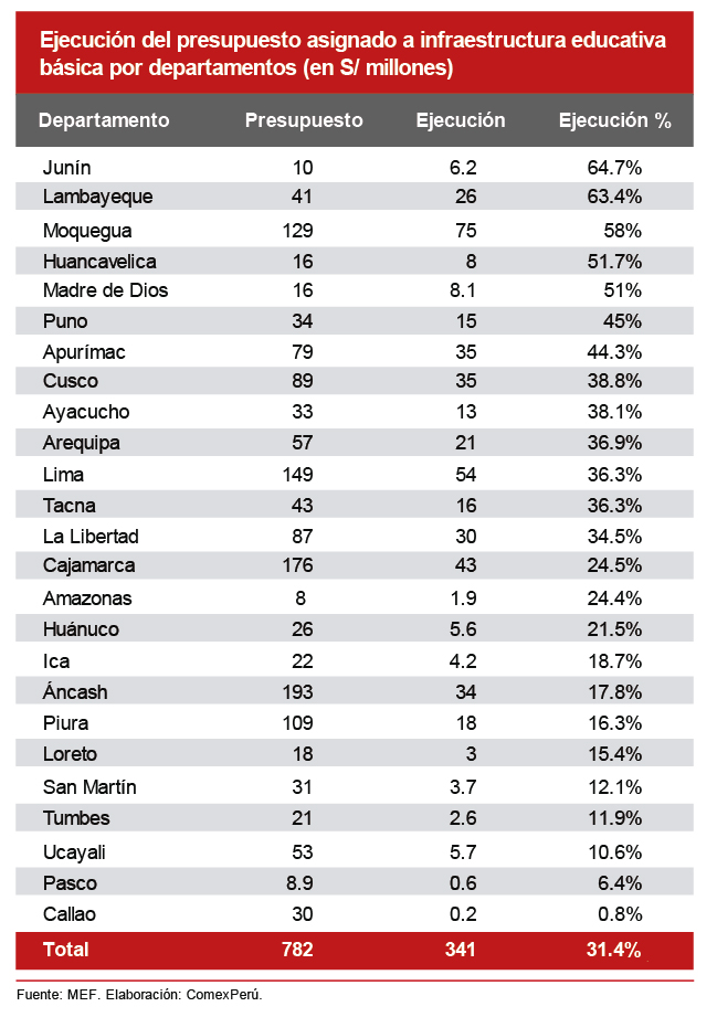 En relación con la educación básica, un 19.1% del presupuesto para la inversión pública fue destinado a mejorar la infraestructura y equipamiento, con S/ 1,478 millones, pero hasta julio solo se han invertido S/ 464 millones (31.4% del presupuesto). El departamento que más ejecutó en lo que va del año es Junín, con S/ 6.2 millones invertidos (64.7% del total de su presupuesto), seguido por Lambayeque (S/ 25,745 millones; 63.4%) y Moquegua (S/ 74,987 millones; 58%).