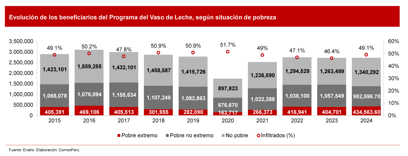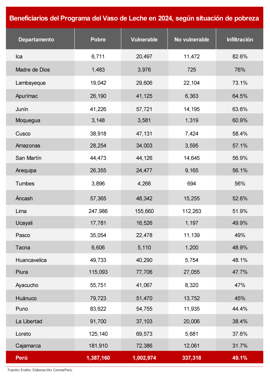 En mayo, el Programa del Vaso de Leche (PVL) cumplió 40 años desde su creación. La iniciativa se creó para distribuir alimentos a la población más vulnerable del país, pero casi la mitad de sus beneficiarios no cumplen con el requerimiento de encontrarse en situación de pobreza. Con problemas de identificación severos, la población infiltrada aumentó en el último año y superó los 1.3 millones, según estimaciones de la Encuesta Nacional de Hogares (Enaho).