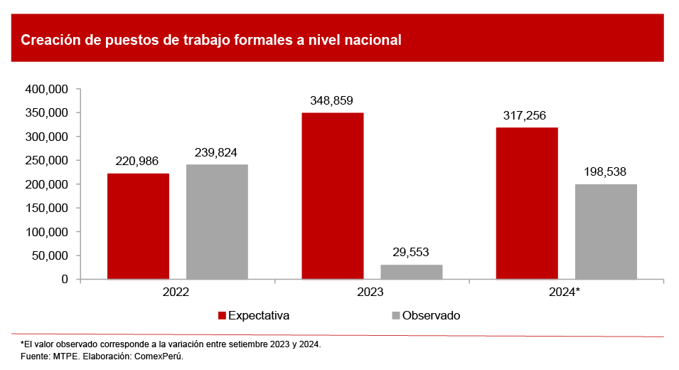 Los resultados de la EDO 2023 anunciaban la creación de 348,859 empleos formales, pero apenas se registraron 29,553 adicionales en dicho año. Para 2024, se esperaban 317,256 puestos de trabajo adicionales, pero solo se habrían sumado 200,000, aproximadamente, según la última información disponible del MTPE.