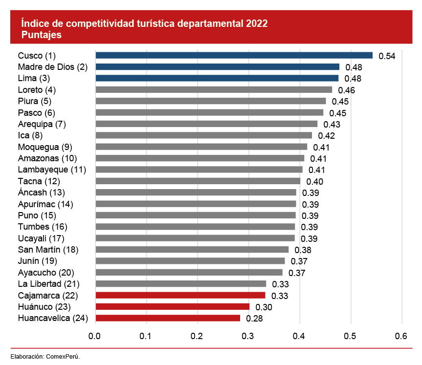 Según el más reciente informe, Cusco lidera el ranking de competitividad turística departamental, y la distancia entre este y el resto de los departamentos es de las más amplias observada, lo cual indica que cuenta con una ventaja en indicadores clave que componen los pilares de competitividad respecto de los demás, según la metodología implementada para el cálculo. Por su parte, Pasco alcanzó la sexta posición en el ranking, mientras que Áncash y Puno se ubicaron en las posiciones 13 y 15, respectivamente.
