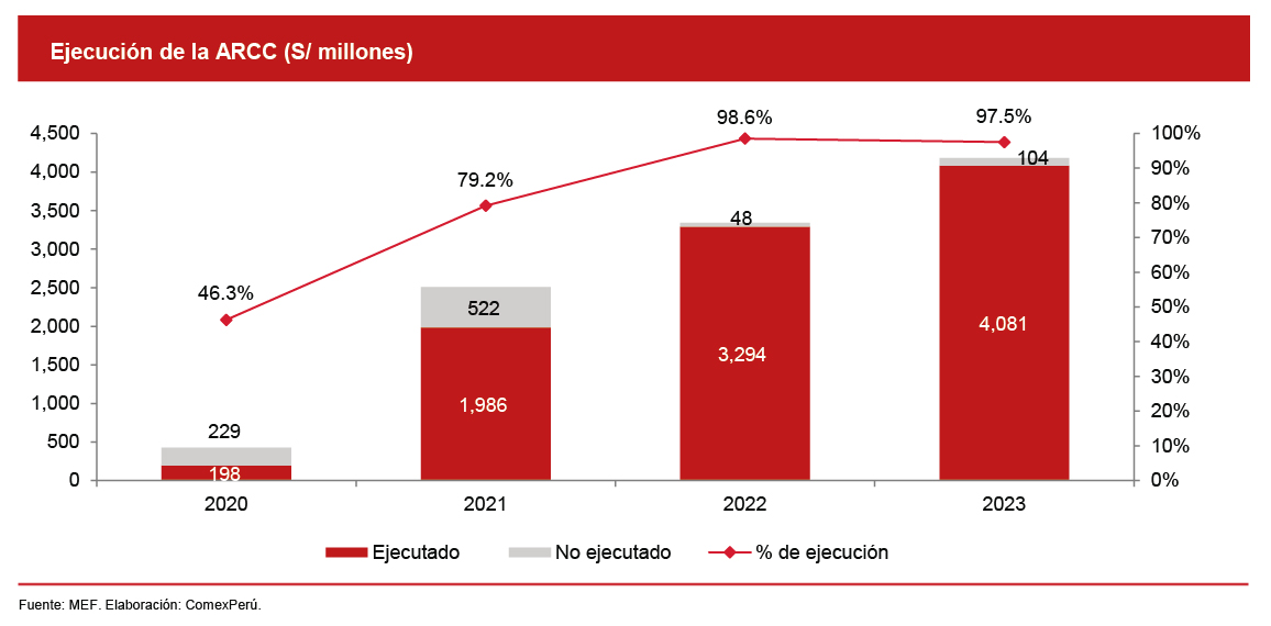 A nivel de la ejecución de sus recursos, si bien en 2020 la ARCC registró una ejecución de tan solo el 46.3% de su presupuesto asignado, debido a las limitaciones del periodo causadas por la COVID-19, el avance se pudo recuperar en 2021 y alcanzó el 79.2%; es decir, S/ 1,986 millones fueron invertidos en una cartera de 126 obras. Entre ellas, S/ 149 millones fueron direccionados a la recuperación de los servicios de salud del hospital de apoyo II-2 de Sullana, en Piura, obra culminada en 2022. El proyecto tiene la capacidad de beneficiar a más de 650,000 habitantes de la localidad y se ha convertido en el centro de salud más importante de Piura. Asimismo, se invirtieron S/ 20 millones en la rehabilitación del local escolar N° 88100 Inmaculada Concepción, en Áncash, lo cual benefició a más de 1,000 alumnos y al cuerpo de 39 docentes.