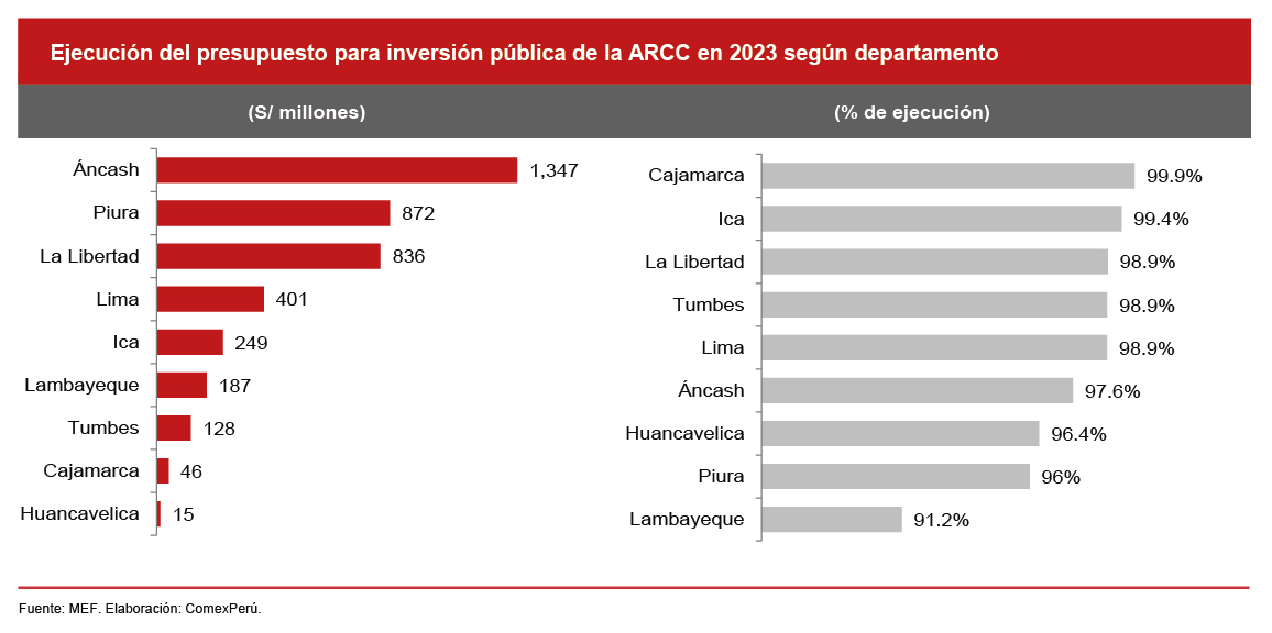 En 2023, la ARCC recibió un presupuesto de S/ 4,185 millones para cumplir sus funciones, del cual ejecutó el 97.5%. De ese monto, S/ 1,347 millones fueron ejecutados en obras relacionadas con las defensas ribereñas, como la creación del servicio de protección ante inundaciones en el río Casma (S/ 150 millones), y en proyectos de salud, como el mejoramiento de los servicios de salud del hospital de apoyo de Recuay (S/ 144 millones).