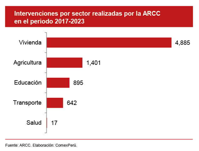 De esta manera, entre las 7,840 intervenciones culminadas en el periodo 2017-2023, 4,885 estuvieron relacionadas con el sector vivienda; 1,401, con el sector agricultura; 865, con el sector educación; 642, con el sector transporte; y 17, con el sector salud, según los datos de la ARCC. Entre las obras culminadas resaltan la construcción y el mejoramiento de establecimientos de salud, carreteras, puentes, pistas y veredas, sistemas de agua y saneamiento, viviendas, canales de riego, bocatomas, diques, defensas ribereñas y drenes en 13 departamentos. A esto cabe añadir que la ARCC ha sido una de las unidades ejecutoras con mayor avance de inversión pública durante varios años.
