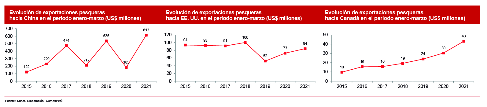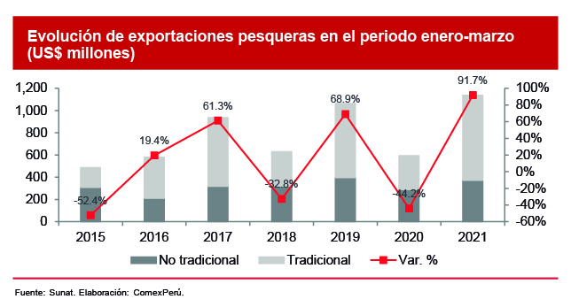 De acuerdo con cifras de la Sunat, durante el primer trimestre de 2021, las exportaciones del sector pesquero alcanzaron un valor de US$ 1,137 millones, un 91.7% más en relación con los tres primeros meses de 2020. Dicho monto representó un 10.2% de las exportaciones totales al mundo, con lo cual aumentó su participación sobre estas en 4.2 puntos porcentuales respecto del primer trimestre de 2020.