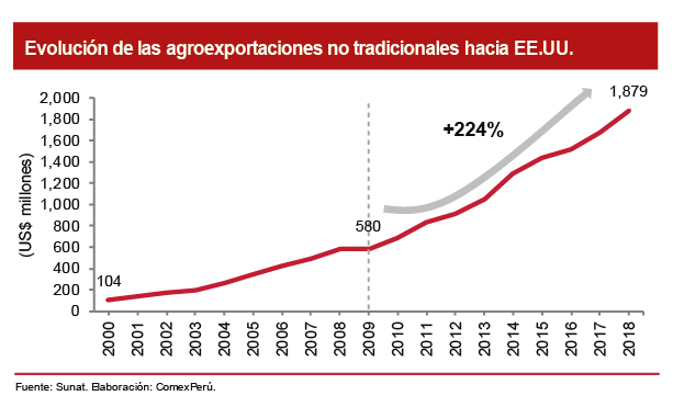 En lo que respecta a las exportaciones peruanas del rubro no tradicional hacia los EE.UU., destaca el dinamismo del sector agroexportador, cuyos envíos representaron el 51.2% de estas y alcanzaron un incremento acumulado del 224% en el periodo 2009-2018, al pasar de US$ 580 millones a US$ 1,879 millones, lo que reflejó un crecimiento promedio anual del 14%. Asimismo, aunque en menor medida, el sector pesquero del rubro no tradicional ha mostrado también un resultado positivo, con una tasa de crecimiento anual promedio del 9.8%; así como el siderometalúrgico, con un 14.1%, y el minero no metálico, con un 20.3%.