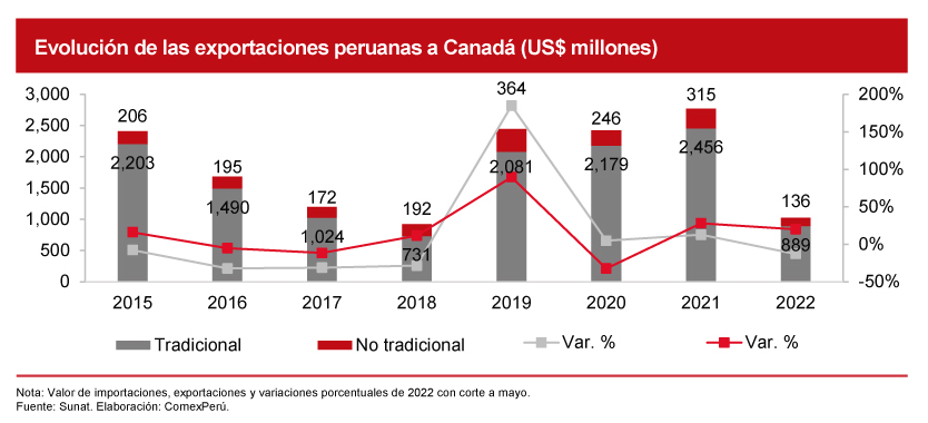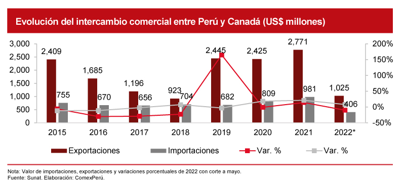 Las cifras de comercio exterior a mayo de 2022 muestran que las exportaciones peruanas a Canadá ascienden a US$ 1,025, un 10% menos que en el mismo periodo de 2021; mientras que las importaciones alcanzaron US$ 406 millones (+8%). De esta manera, siguiendo la trayectoria del comercio vista en los últimos años y a la espera de una reactivación económica hacia la segunda mitad de 2022, las exportaciones peruanas a Canadá podrían lograr un incremento del 8% frente a 2021.