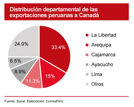 De esta manera, los resultados demuestran la relevancia de Canadá como sólido socio comercial para la industria peruana, y su rol fundamental para la generación de divisas y atracción de inversión privada al ser uno de los principales compradores de industrias extractivas. Sin embargo, este es solo un panorama general que engloba el beneficio que el TLC ha generado en las economías locales de distintos departamentos del país. De acuerdo con cifras de la Sunat, en 2021, los envíos de productos peruanos a Canadá provinieron principalmente de La Libertad. El valor exportado en dicha región fue de US$ 925 millones, que equivale a un 33% del total y representa un incremento del 28% frente a lo enviado en 2020. Le siguen Arequipa, con envíos por US$ 416 millones, Cajamarca (US$ 312 millones), Ayacucho (US$ 248 millones) y Lima (US$ 180 millones).