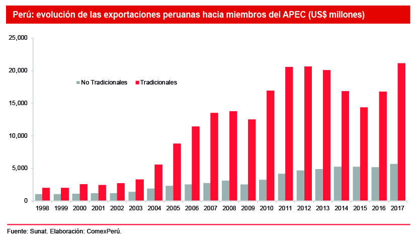Estos esfuerzos han servido para aumentar el flujo de comercio, y la evolución de nuestras exportaciones es un ejemplo de ello. Así, se observa un crecimiento acumulado del 790.7%, en el periodo 1998-2017, en nuestras exportaciones que tuvieron como destino a países miembros del APEC. En 2017, los países pertenecientes a este bloque recibieron US$ 26,819 millones, un 60.5% del total de nuestros envíos al mundo.