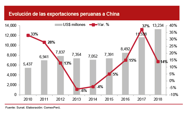 Según cifras de la Sunat, entre 2010 y 2018, las exportaciones peruanas con destino a China registraron un crecimiento acumulado del 143% y un crecimiento promedio anual del 11.8%. Desde 2011, año en el que China desplazó a EE.UU. como primer destino de exportación peruano, nuestros envíos a este país han mantenido un crecimiento sostenido (a excepción de 2013 y 2014). Para el periodo enero-diciembre de 2018, las exportaciones peruanas hacia este mercado sumaron un total de US$ 13,234 millones, un 14.1% más con respecto al año anterior. Dicho resultado estuvo impulsado por el rubro tradicional (14% más que en 2017), que representó el 96.4% de los envíos totales, y el no tradicional (+16.1%). Gracias a estos resultados, China se posicionó como el principal destino de nuestras exportaciones, con un 28% de los envíos, por encima de países como EE.UU. (17%) y Suiza (5%).