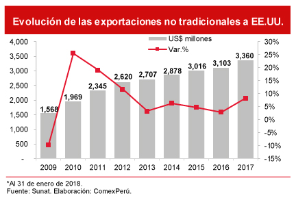 El TLC dio inicio a una nueva etapa en nuestras exportaciones, caracterizada por un crecimiento exponencial que se tradujo en nuevos puestos de trabajo y ahorros significativos para las empresas peruanas en el comercio internacional. De acuerdo con cifras de la Sunat, entre 2009 y 2017[1], nuestras exportaciones totales al mercado estadounidense registraron un crecimiento acumulado del 43.8%, con una marcada tendencia positiva en el desempeño de las exportaciones no tradicionales —que incorporan un mayor valor agregado—, las que crecieron un 114.3% en el mismo periodo, lo que equivale a una tasa de crecimiento promedio anual del 10%, muy por encima de la registrada por las exportaciones totales (4.6%).