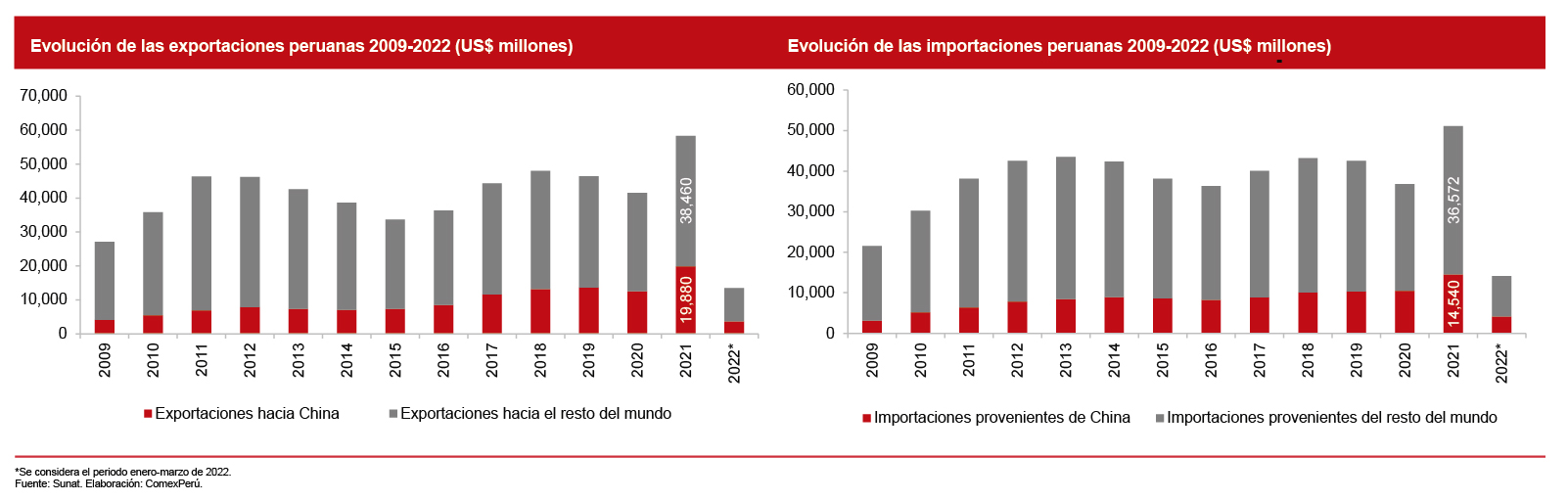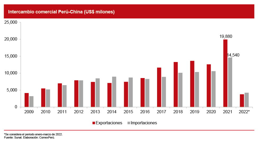 Como hemos mencionado en ediciones anteriores, 2021 fue un año récord para nuestras exportaciones. En dicho año, el valor de nuestros envíos al mundo sumó un total de US$ 58,341 millones, un 40.4% más respecto de 2020. Un aspecto clave es la importancia de China para nuestro comercio internacional, pues captó el 34.1% del total de nuestros envíos al exterior (US$ 19,880 millones); mientras que, por el lado de las importaciones, representó el 28.4% del total de nuestra demanda del exterior (US$ 4,175 millones). Dichas cifras posicionan a China como el principal destino de nuestros envíos al mundo —posición que mantiene desde 2011, año en el que desplazó a EE. UU.—, además de ser el principal país de origen de nuestra demanda del exterior —posición que mantiene desde 2014, año en que desplazó al país norteamericano—, según cifras de la Sunat.
