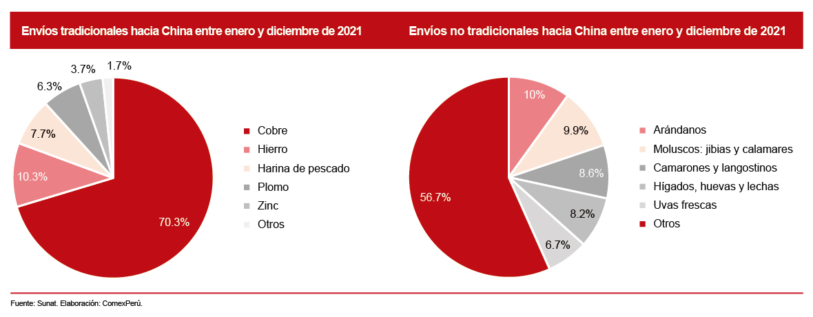 Respecto de nuestros envíos al gigante asiático en 2021, los minerales lideran la lista, por lo que los productos tradicionales continúan encabezando nuestras exportaciones. Destacan los envíos de cobre, que sumaron un total de US$ 13,519 millones entre enero y diciembre de 2021, y representaron el 68% de nuestras exportaciones totales. Le siguen el hierro (US$ 1,972 millones; 9.9%), la harina de pescado (US$ 1,470 millones; 7.4%) y el plomo (US$ 1,216 millones; 6.1%).