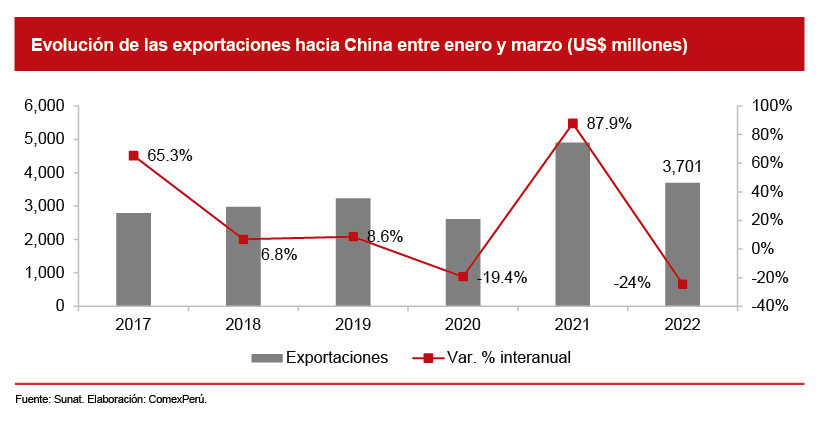 Así, en marzo de este año, las importaciones chinas cayeron un 0.1% con respecto al mismo mes del año anterior, según cifras de la Administración General de Aduanas de China. Esta caída es la primera registrada después de agosto de 2020, mes en que el país asiático se recuperaba de la primera ola de la pandemia de COVID-19. Solo en marzo de 2022, nuestras exportaciones hacia este destino cayeron un 26.4% con relación al mismo mes de 2021. Este descenso se explicó, principalmente, por nuestros menores envíos de hierro (-97.2%), zinc (-86.1%) y cobre (-31.7%).