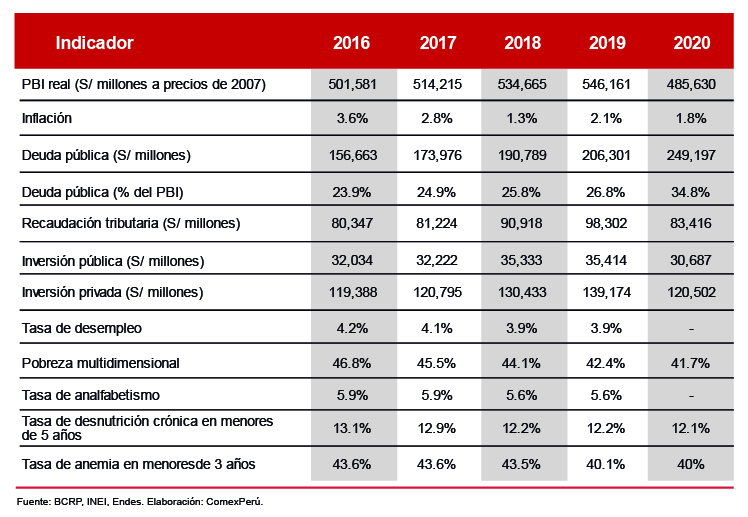 Si analizamos el empleo y los ingresos, según cifras del Instituto Nacional de Estadística e Informática (INEI), en 2019, la tasa de desempleo decreció en 0.3 puntos porcentuales respecto de la tasa de 2016, con lo que cayó de 4.2% a 3.9%, y el ingreso promedio mensual proveniente del trabajo se incrementó a S/ 1,443.1, superior a los S/ 1,370.7 de 2016. Por otro lado, los niveles de pobreza multidimensional en el país no dejan de ser altos. En 2016, el 46.8% de la población era pobre, cifra que progresivamente decreció hasta el 41.7% en 2020. Asimismo, respecto del sector educación, la tasa de analfabetismo decreció en 0.3 puntos porcentuales, al pasar del 5.9% al 5.6% entre 2016-2019. Cabe resaltar que el objetivo del Ministerio de Educación en 2019 era reducir la tasa hasta el 3.8%, cifra que no se alcanzó.