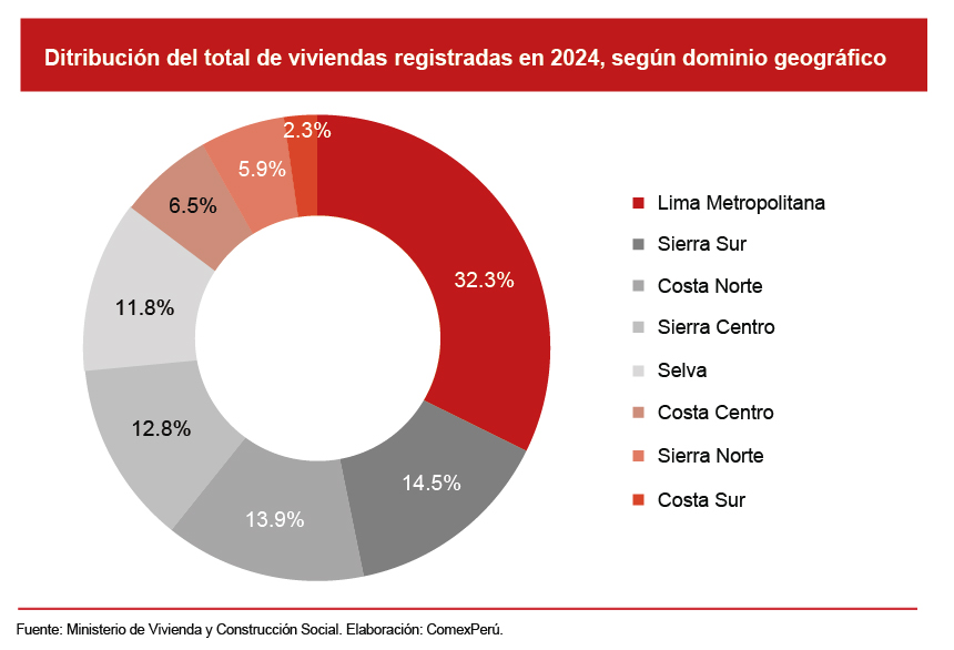 En 2024, del total de viviendas a nivel nacional, el 32.3% se ubicaron en Lima Metropolitana, el 33.1% en la Sierra; el 22.8% en la Costa, sin Lima; y el 11.8% restante, en la Selva. Lima Metropolitana concentra 3 de cada 10 viviendas en el Perú, lo cual demuestra la concentración poblacional. Por tanto, la creación de nuevas viviendas formales por parte del sector privado responde a la demanda habitacional. Es coherente que la mayoría de nuevas edificaciones se concentren en aquellas zonas donde más peruanos demandan viviendas.