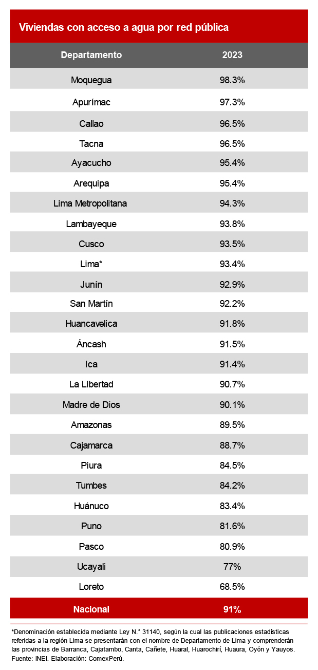 En todos los departamentos, más del 50% de las viviendas tenían acceso a agua por red pública. En Pasco (80.9%), Ucayali (77%), y Loreto (68.5%), la cobertura fue menor o igual al 81%. En comparación, los departamentos con mayor cobertura fueron Moquegua con 98.3%, Apurímac con 97.3% y Tacna con 96.5%.
