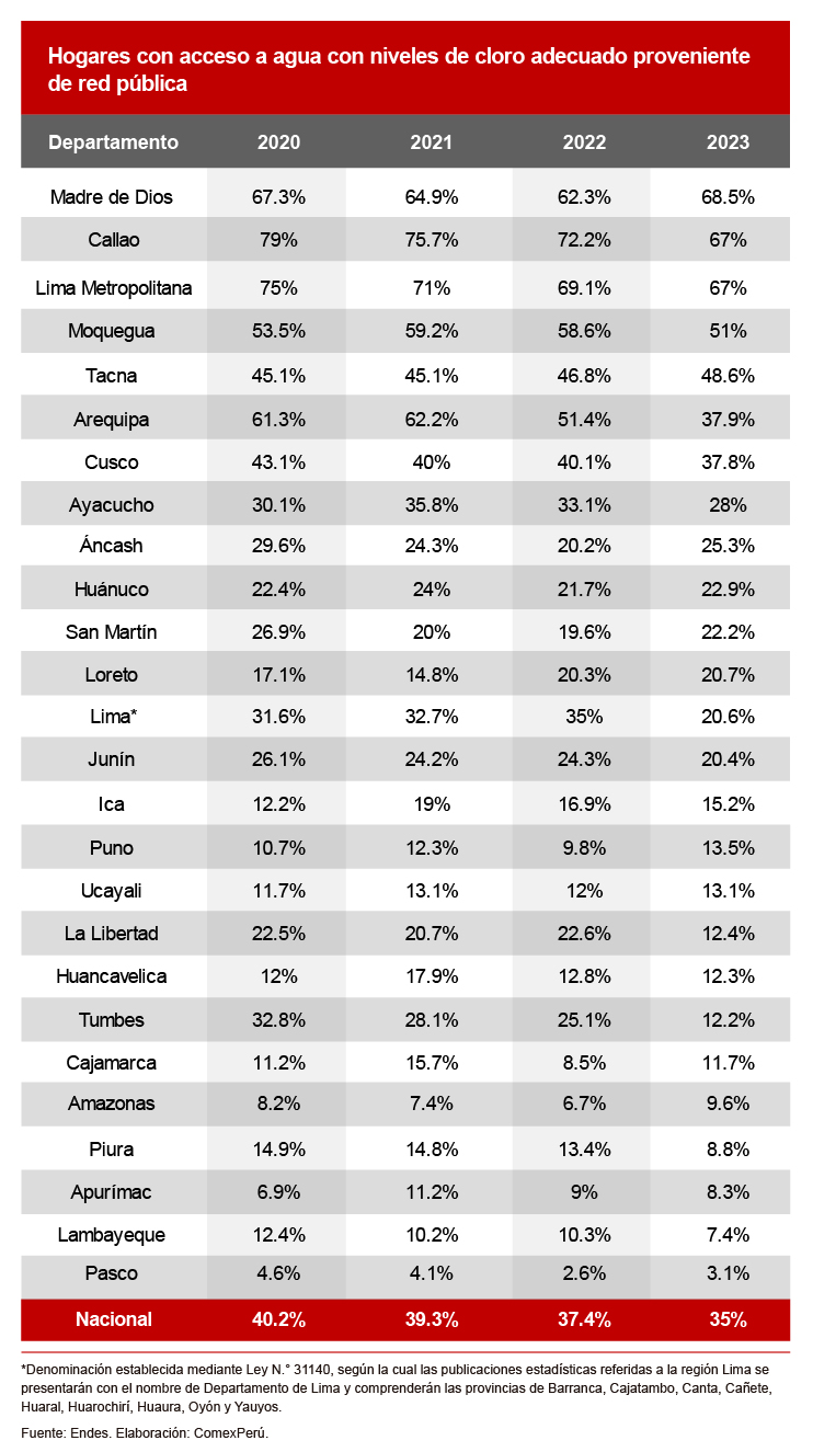 El acceso al agua de los hogares por red pública con un nivel de cloro adecuado fue limitado en la mayoría de los departamentos. Madre de Dios (68,5%), Callao (80.5%) y Lima Metropolitana (78.3%) lideran el acceso a nivel nacional. De los 24 departamentos, solo 2 tuvieron un porcentaje superior al 50%. Los que registraron un mayor porcentaje fueron Madre de Dios con un 68,5% y Moquegua, con un 51%. En contraste, los departamentos con un menor porcentaje fueron Apurímac (8.3%), Lambayeque (7.4%) y Pasco (3.1%).