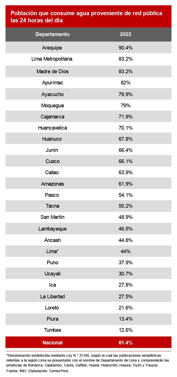 En 2022, menos del 50% de la población de 11 departamentos tuvo acceso al servicio de agua por red pública las 24 horas del día, según el INEI. Los departamentos con los menores porcentajes fueron Loreto, con un 21.6%; Piura, con un 13.4%; y Tumbes, con un 12.6%. En contraste, un 90.4% de los pobladores de Arequipa tenían acceso a este servicio las 24 horas del día, seguidos por el 83.2% en Madre de Dios y el 82% en Apurímac. Lima Metropolitana también presentó un porcentaje superior al 80%.