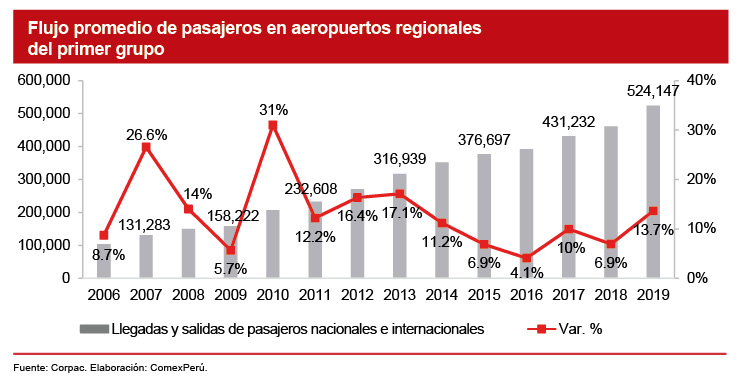 Si bien seis de los 12 aeropuertos regionales del primer grupo son internacionales, tan solo un 0.2% de sus entradas y salidas tienen como origen o destino el exterior, según cifras de la Corporación Peruana de Aeropuertos y Aviación Comercial (Corpac). Estos aeropuertos serán los responsables de hacer sostenible la oferta turística interna, por lo cual urge agilizar inversiones, reformular procesos y analizar qué barreras les impiden despegar para ser verdaderos puertos de desarrollo turístico.