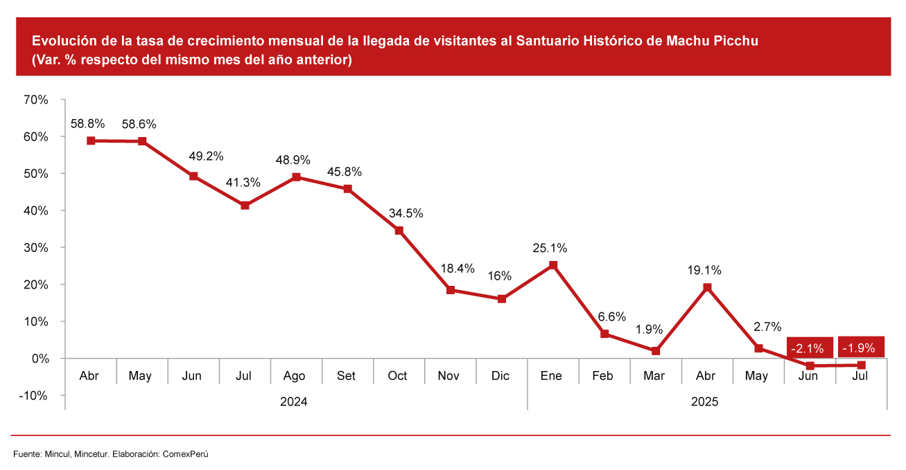 La afluencia de visitantes a la ciudad perdida de los incas ya empieza a mostrar señales de una inadecuada e ineficaz gestión. Según datos oficiales de la Dirección Desconcentrada de Cultura de Cusco (adscrita al Mincul), reportados por el Mincetur, en junio ingresaron 130,796 visitantes al Santuario Histórico de Machu Picchu, un 2.1% menos que en junio de 2024. Además, la caída mensual continuó en julio: 158,522 visitantes (entre nacionales y extranjeros) arribaron a Machu Picchu, un 1.9% menos que en el mismo mes del año anterior.