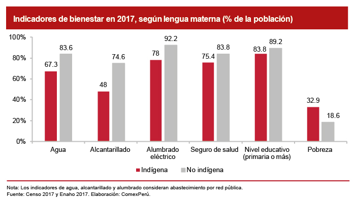Bajo la clasificación por lengua materna, se evidencia que la brecha de acceso a servicios básicos es más alta para pueblos de lengua indígena. Por ejemplo, mientras el 83.6% de la población no indígena accede al agua por red pública, el 67.3% de la población indígena lo hace, es decir, existe una diferencia de casi 20 pp. En el caso del alcantarillado (desagüe) el acceso es mucho más diferenciado, pues menos de la mitad de la población de lengua indígena posee el servicio y existen casi 30 pp de diferencia con su contraparte. En cuanto a la tenencia de seguro y el nivel educativo también existen diferencias, aunque menos pronunciadas que en los casos anteriores. Además, vale recalcar que un 32.9% de la población indígena es pobre, porcentaje que nuestro país tenía en conjunto hace unos 10 años.