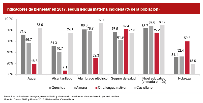 De manera más desagregada, se aprecia que la mayor ausencia del Estado se encuentra en aquellos territorios de población cuya lengua materna es distinta del quechua, aimara o castellano, es decir, donde se hablan lenguas amazónicas. No es un secreto que dichos territorios se encuentran más alejados al encontrarse en la selva del Perú, pero basta analizar algunos indicadores para darnos cuenta de la magnitud del problema. Por ejemplo, tan solo un 18.6% accede al agua por red pública, únicamente un 7.1% a alcantarillado por red pública y un 29.3% a alumbrado eléctrico por red pública. Todo ello supone un gran deterioro en la calidad de vida, debido a las enfermedades por el uso de agua contaminada, así como la falta de electricidad para emergencias o para el almacenamiento de vacunas en los centros de salud, tan solo por mencionar algunos casos.