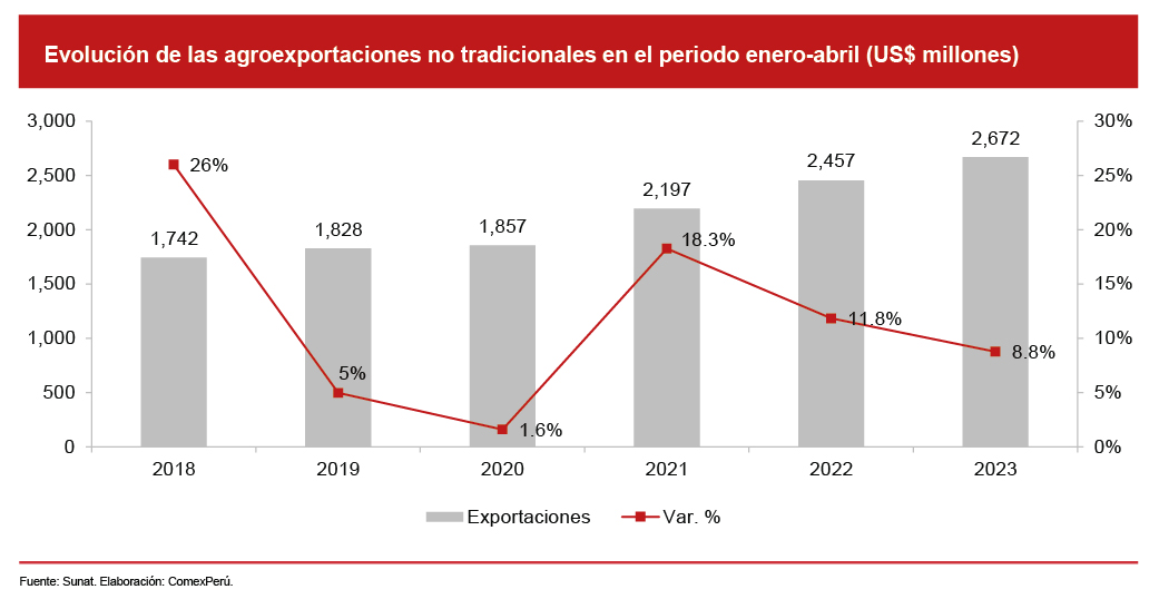 Por otro lado, de acuerdo con cifras de la Sunat, durante el periodo enero-abril de 2023, las agroexportaciones no tradicionales ascendieron a US$ 2,672 millones, lo que reflejó un crecimiento del 8.8% con respecto al mismo periodo del año anterior. Sin embargo, llama la atención que dicho dinamismo haya sido menor al de años anteriores, puesto que, en el mismo periodo de análisis, para los años 2021 y 2022, los crecimientos fueron del 18.3% y el 11.8%, respectivamente. Asimismo, cabe mencionar que, en los últimos seis años, los envíos de este tipo de productos alcanzaron un crecimiento promedio anual del 9.1%.