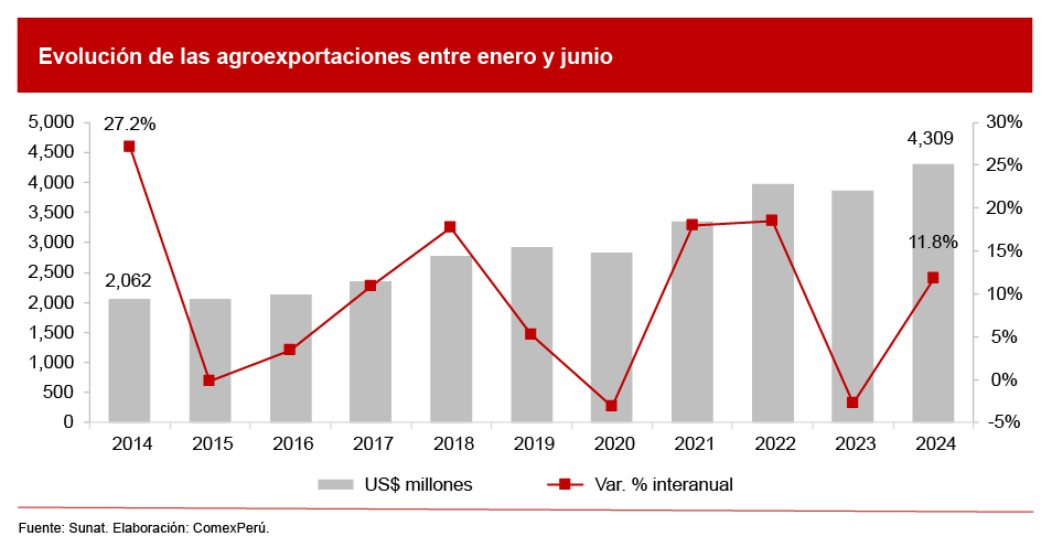Las agroexportaciones representaron el 13% de nuestras ventas al mundo entre enero y junio de 2024. Estas sumaron US$ 4,309 millones, lo que reflejó un incremento del 11.8% con relación al mismo periodo de 2023, según cifras de la Sunat.