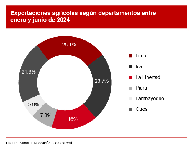 Entre los principales departamentos que contribuyeron a las agroexportaciones, Lima se ubica en el primer lugar, con US$ 1,083 millones, lo que reflejó un crecimiento interanual del 31.5%. Le siguen Ica (+13.7%), La Libertad (+14.6%), Piura (-24.5%) y Lambayeque (-29%).