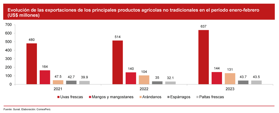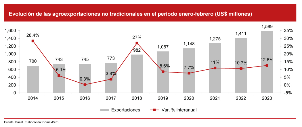 En lo que respecta a las agroexportaciones no tradicionales, en el período enero-febrero de 2023, sumaron un valor de US$ 1,589 millones, lo que reflejó un incremento del 12.6% con respecto al mismo período de 2022, y un crecimiento promedio anual del 9.5% desde 2014.